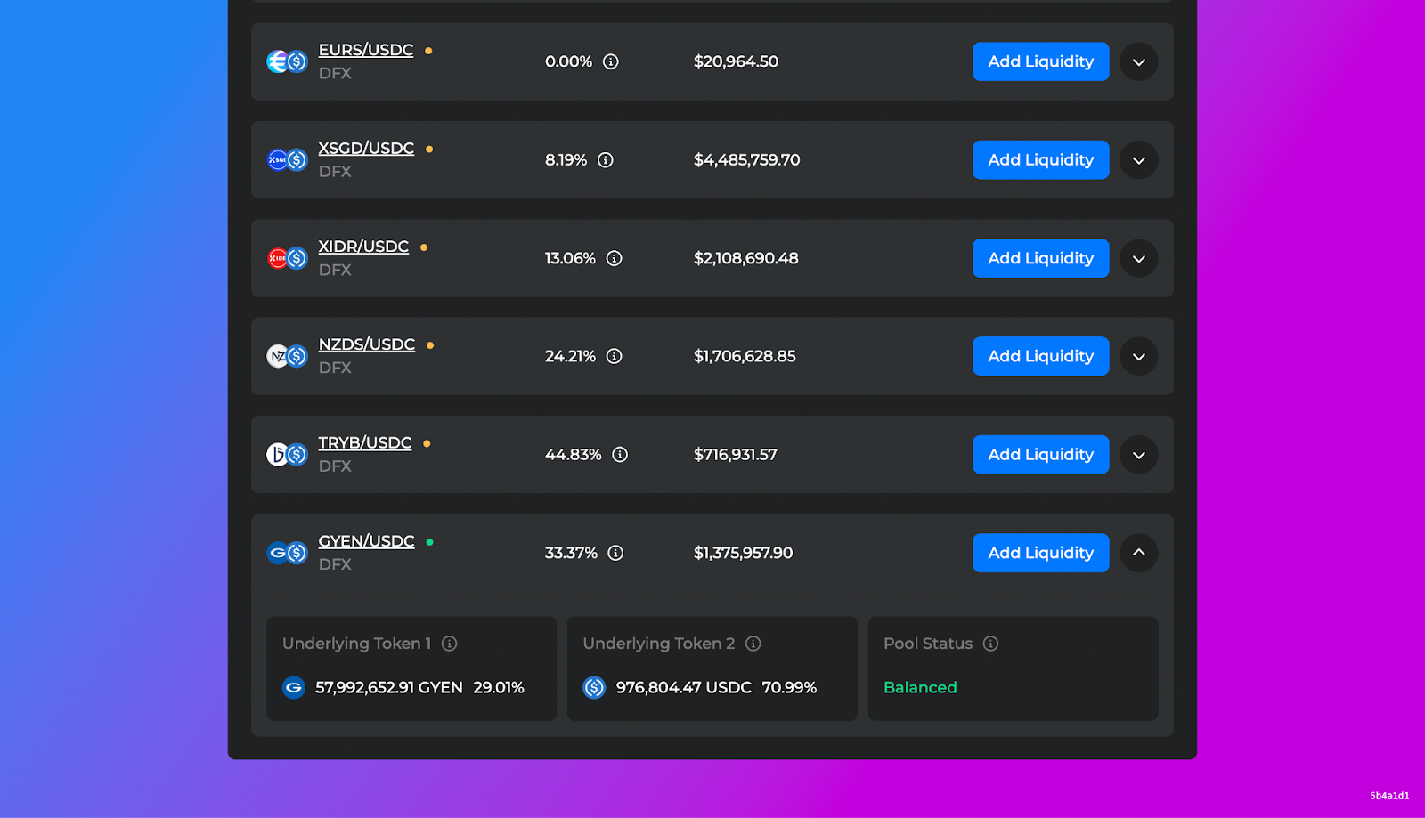 במדור הבריכות תוכלו לראות מגוון בריכות נזילות. חלקם הם בריכות חיצוניות על Balancer, Curve Finance ו- Sushi Swap. מאגרים חיצוניים אלו אינם מעניקים תגמול אינפלציוני DFX לספקי נזילות. עם זאת, המאגרים המקומיים של DFX Finance מעניקים תגמולים אינפלציוניים של DFX לספקי נזילות, כפי שהוזכר קודם לכן.