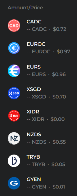 但是，DFX Finance 的一个关键区别在于它仅支持一种美元支持的稳定币，即 USDC。其余支持的稳定币是外国稳定币。支持的资产有：