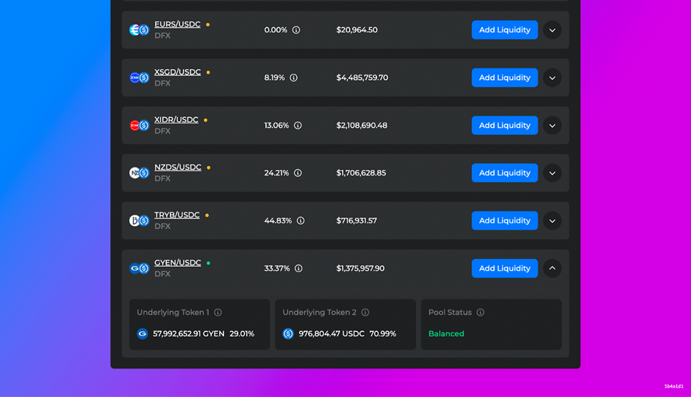 接下来，重要的是要了解平衡池和非平衡池的概念和区别。如果两种资产的价值比率在定义的限制范围内，则流动性池保持平衡。例如，对于 CADC/USDC 池，这个限制在 29–71% 之间。目前，在撰写本文时，该池包括 50.89% 的 CADC 和 49.11% 的 USDC，因此在该范围内。同样，当池平衡时，ChainLink 预言机会影响掉期的价格。但是，如果其中一项资产的价值与另一项资产的价值之比超过定义的限制，则认为资产池是不平衡的。例如，对于 GYEN/USDC 池，此限制在 30–70% 之间。然而，目前，包括 28.99% GYEN 和 71.01% USDC。因此，它有点不平衡。对于不平衡的池，掉期决定并影响价格。池将保持不平衡，直到有人换掉提供正滑点的一方。此外，如果池不平衡，则在启动交换时会产生更大的价格影响。在我们的示例中，将 GYEN 换成 USDC 将导致正滑点，并再次重新平衡池。